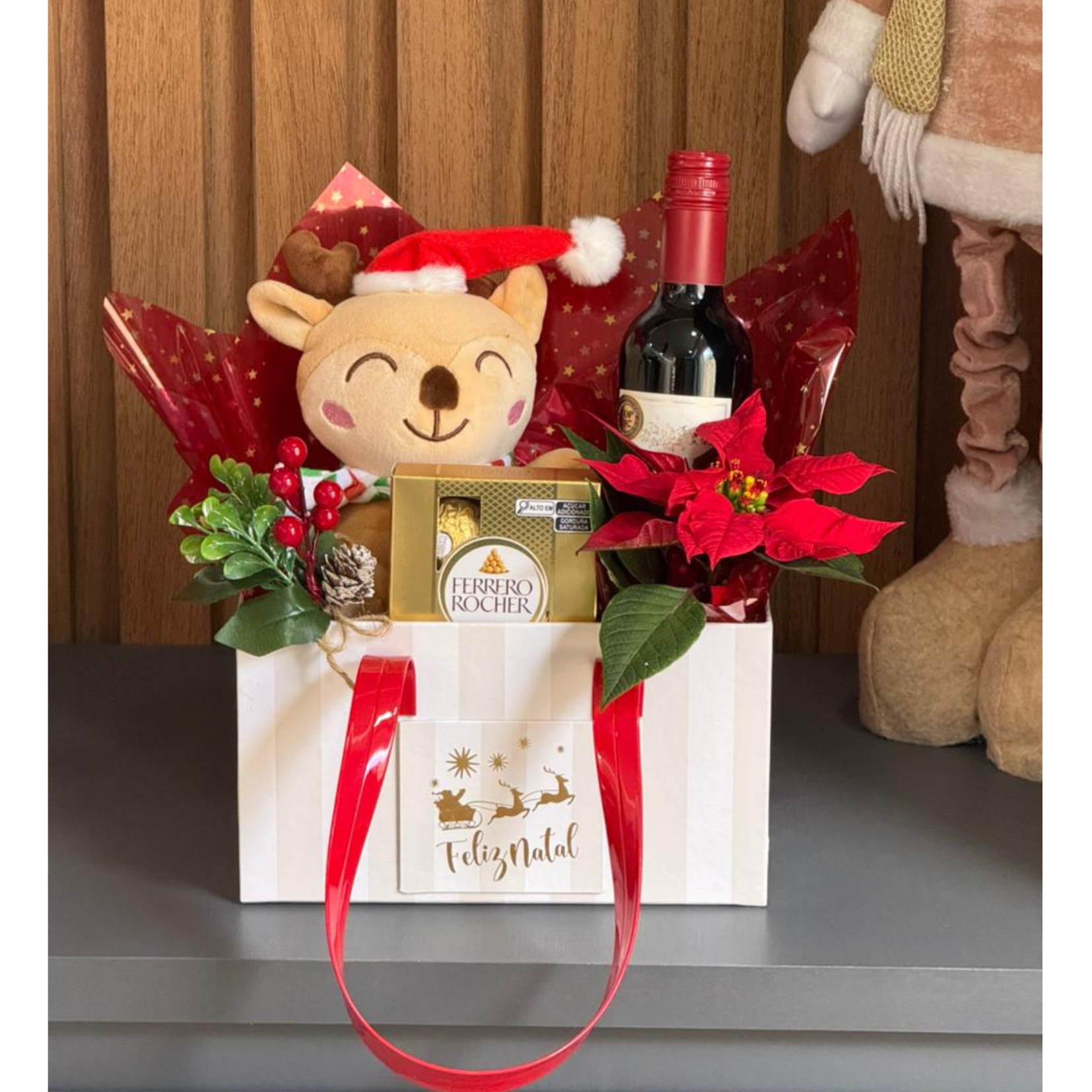 Bag feliz natal composta por pelúcia de natal, vinho reservado mini (mj), ferrero rocher 4un, mini flor do natal e enfeites