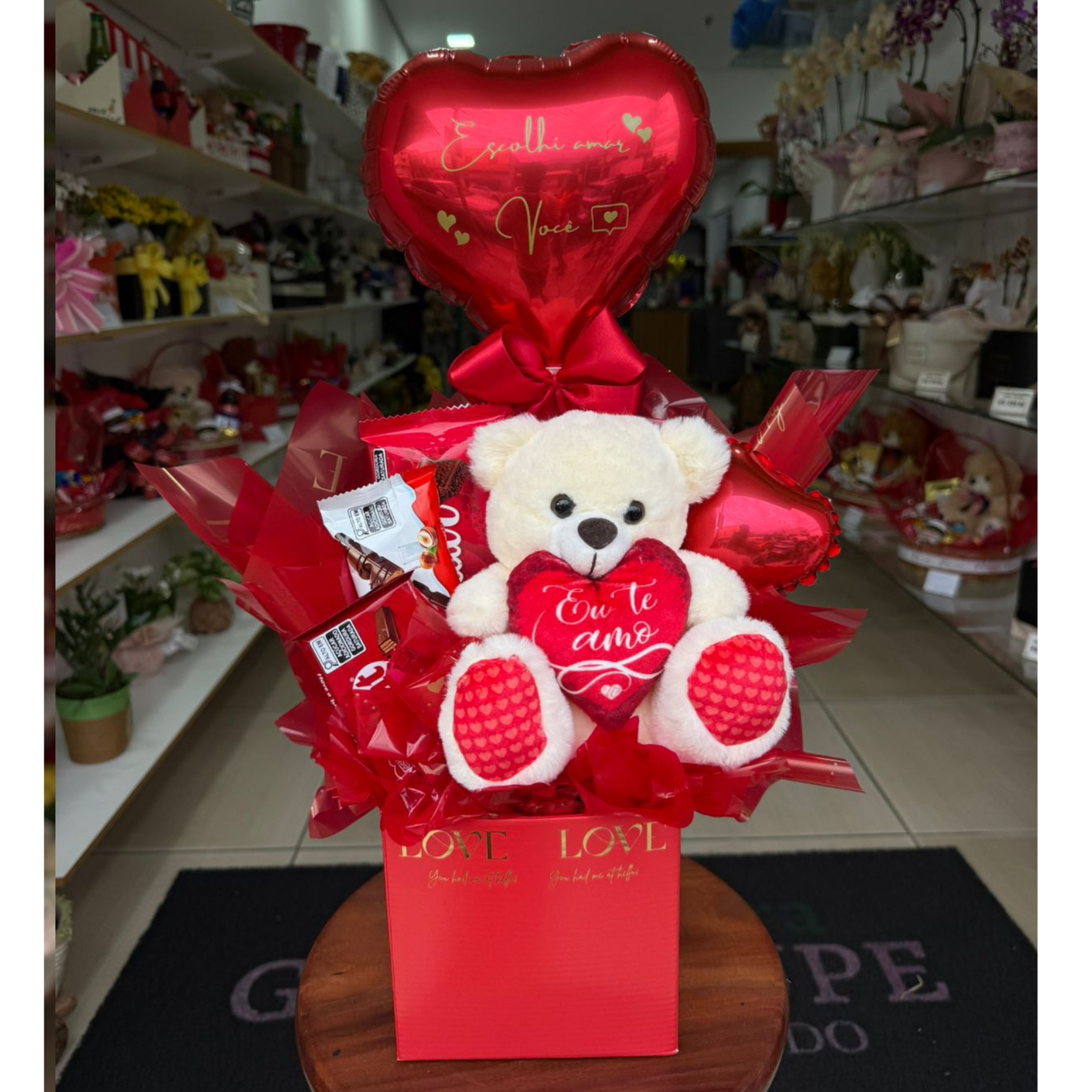 Box ballon composto por pelúcia urso p, kit kat, barra de chocolate suflair, kinder bueno, balão P personalizado