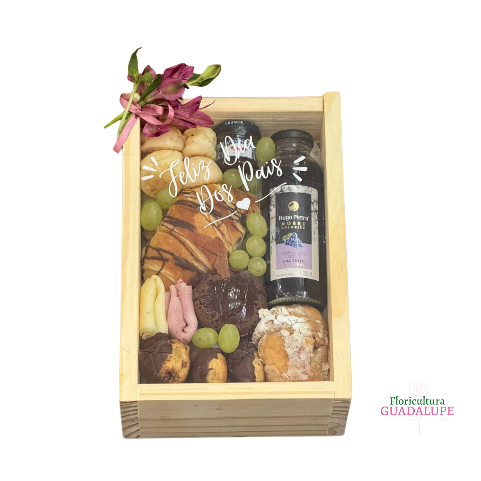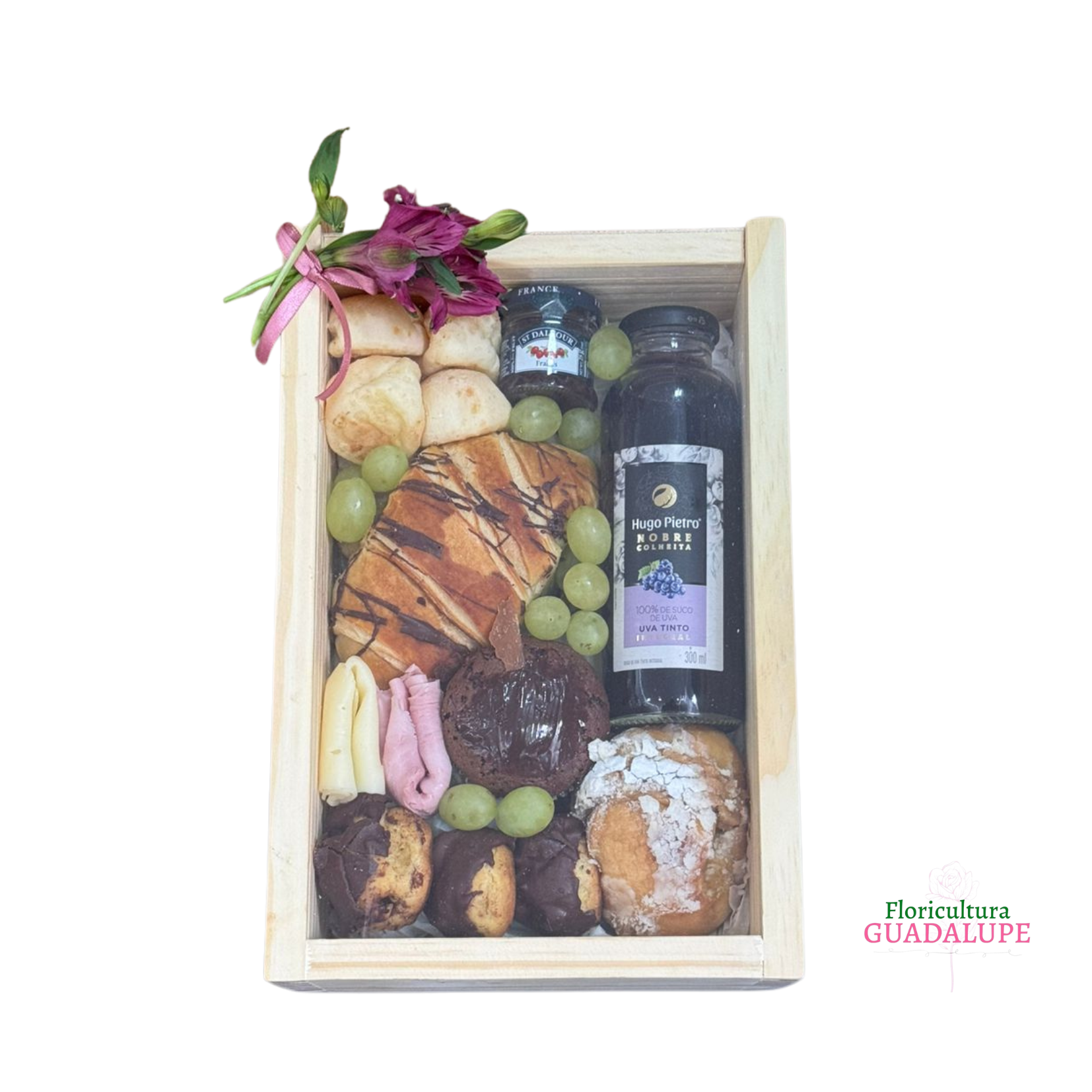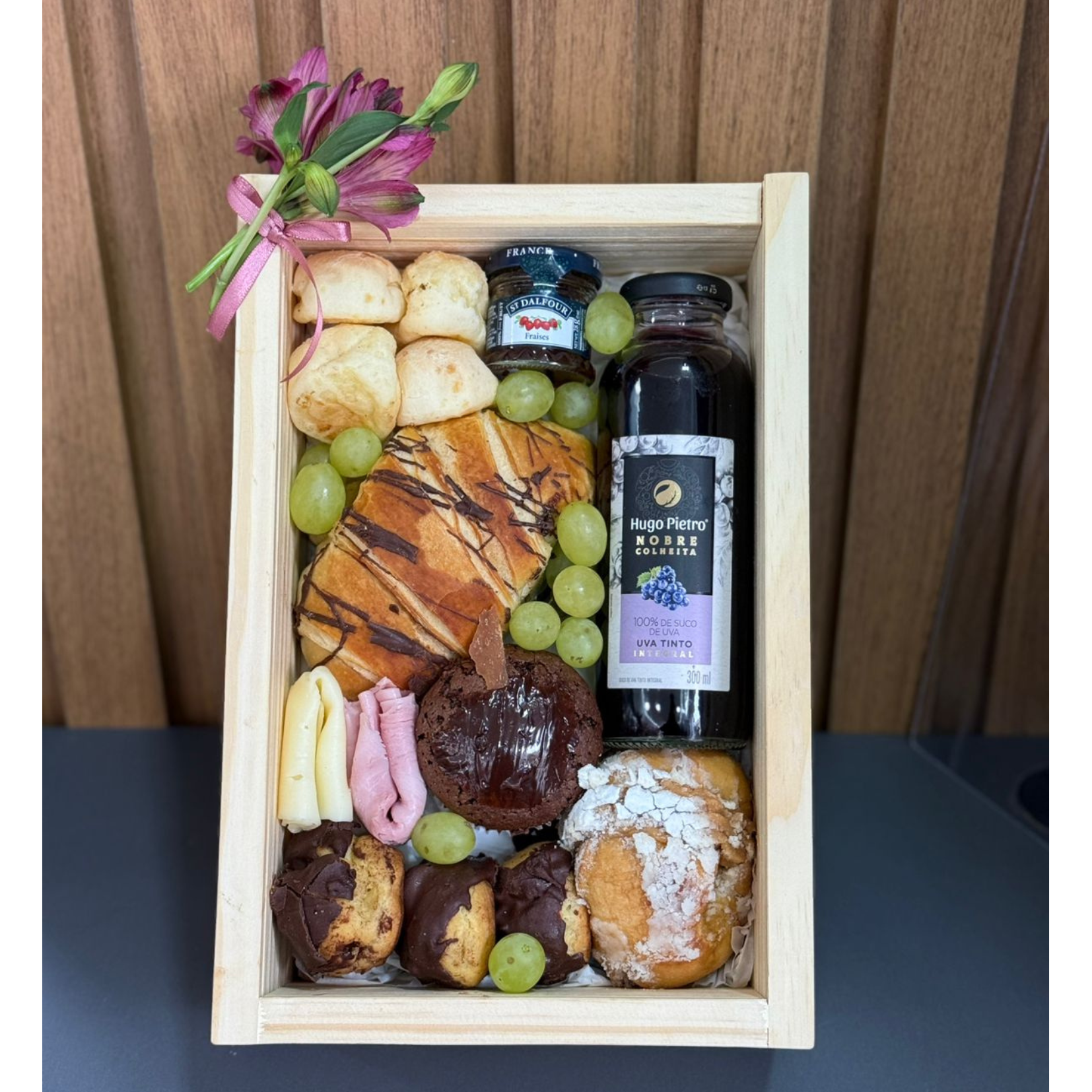 Box café edição com visor de acrílico composto por mini geleia, suco de uva integral, minis pão de queijo, mini brownie, croissant de chocolate, sonho, carolinas, frios e uvas
