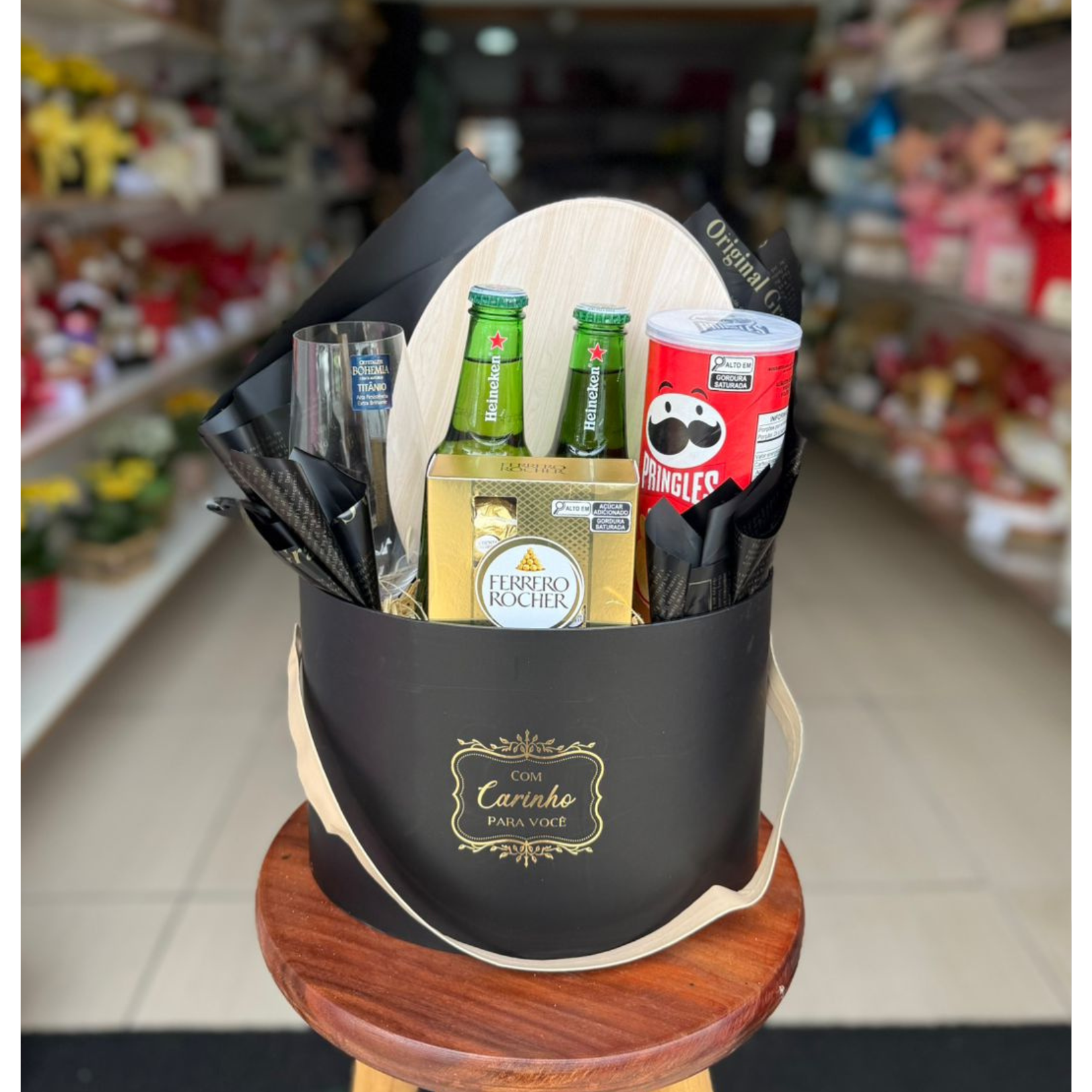 Box luxo com carinho composto por batata pringles, bombons ferrero rocher 4un, 2 cervejas heineken e taça de cristal bohemia