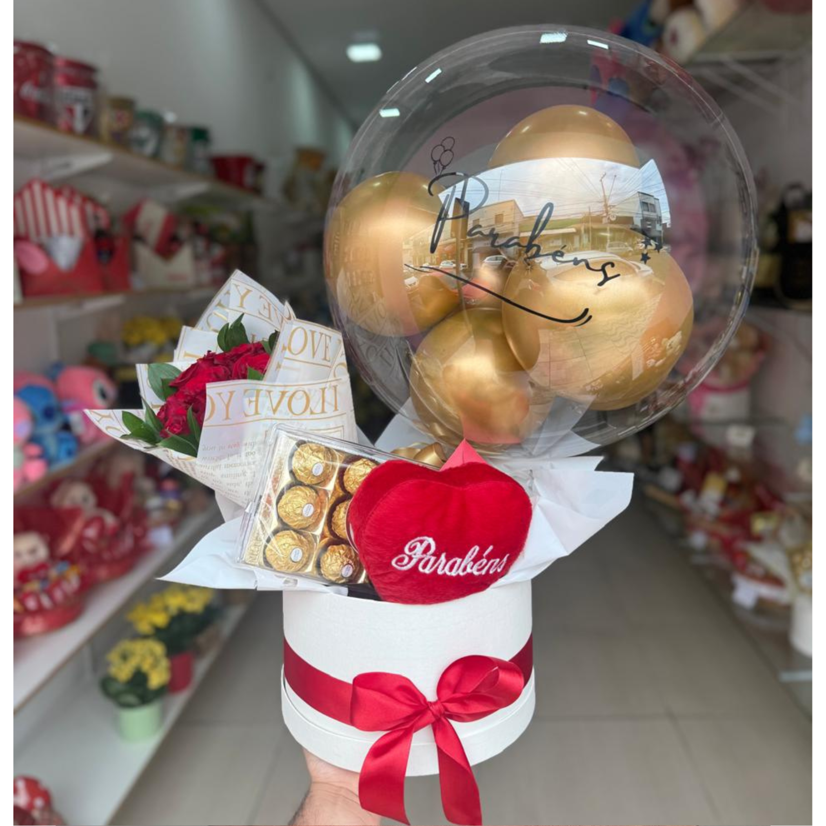 Box luxo composto por balão bubble G com frase "parabéns", pelúcia coração P "parabéns", Bombons ferrero rocher 12un e combo de 6 rosas vermelhas