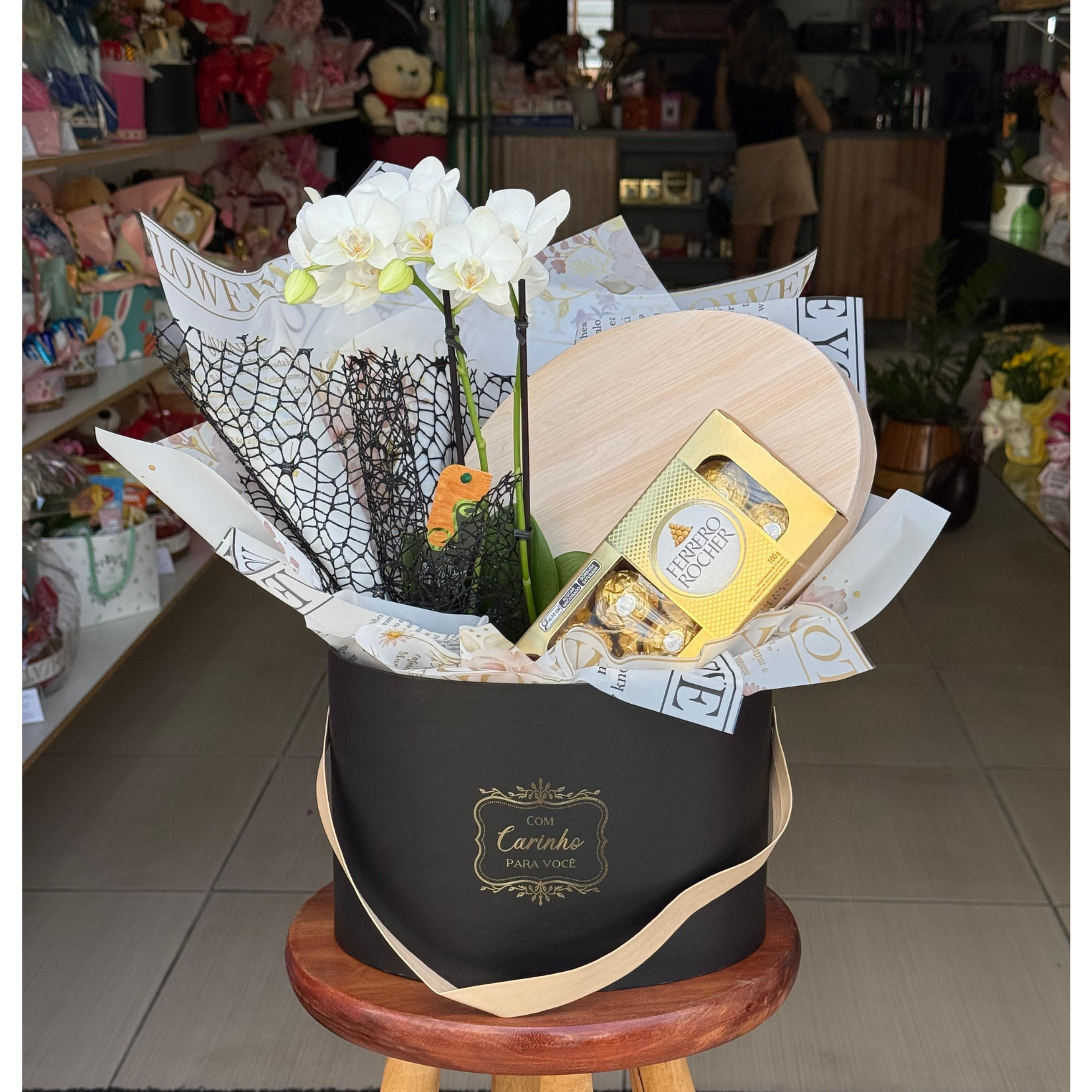 Box linha premium composto por mini orquídea e bombom Ferrero Rocher