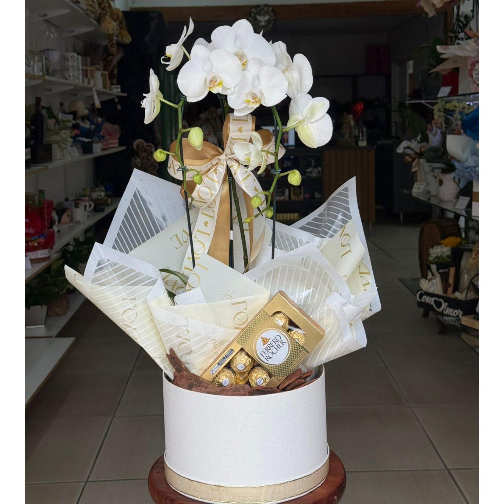Box orquídea de luxo composto por orquídea em embalagem de presente com cascas de pinus e bombons ferrero rocher 8un