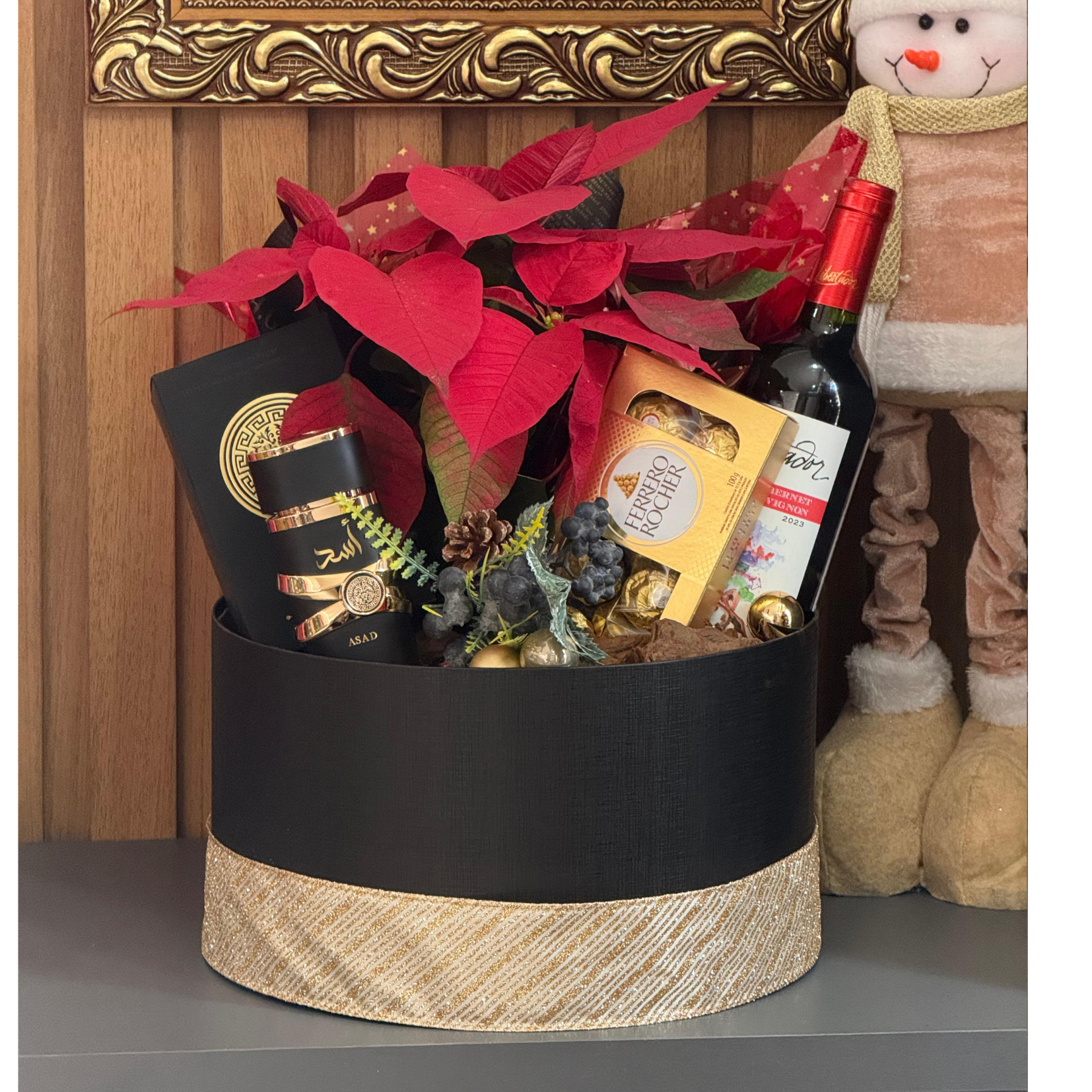 Box premium natalino composto por perfume original Asad (lattafa), flor do natal (poinsettia), Ferrero rocher 8un e vinho el salvador