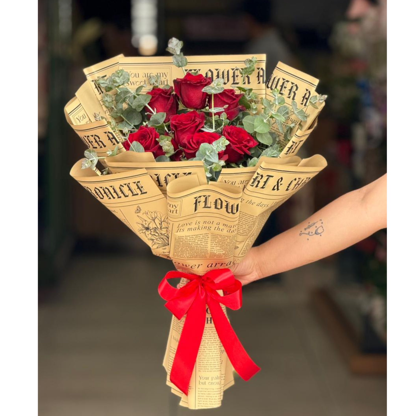 Buquê de 7 rosas em embalagem luxo coreana jornal