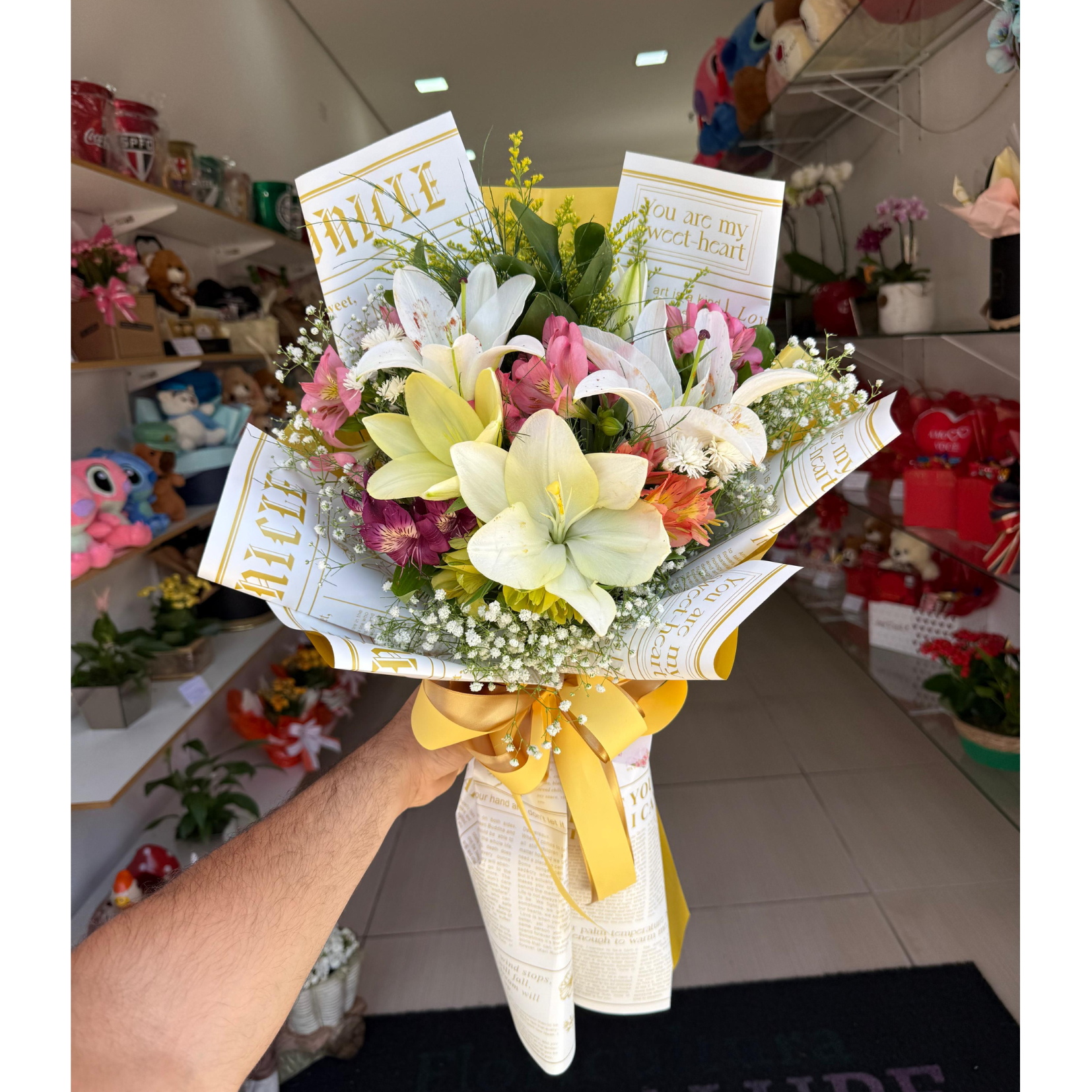Buqê Glan, composto por 3 lírios (cores disponíveis em estoque) e demais flores em embalagem de luxo