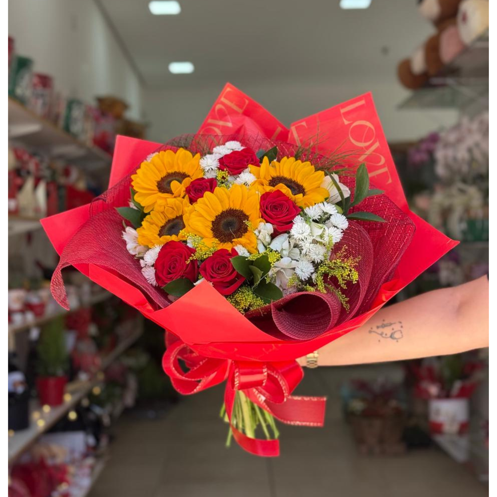 Buquê composto por 4 girassóis, 5 rosas vermelhas e demais flores em embalagem edição "love"