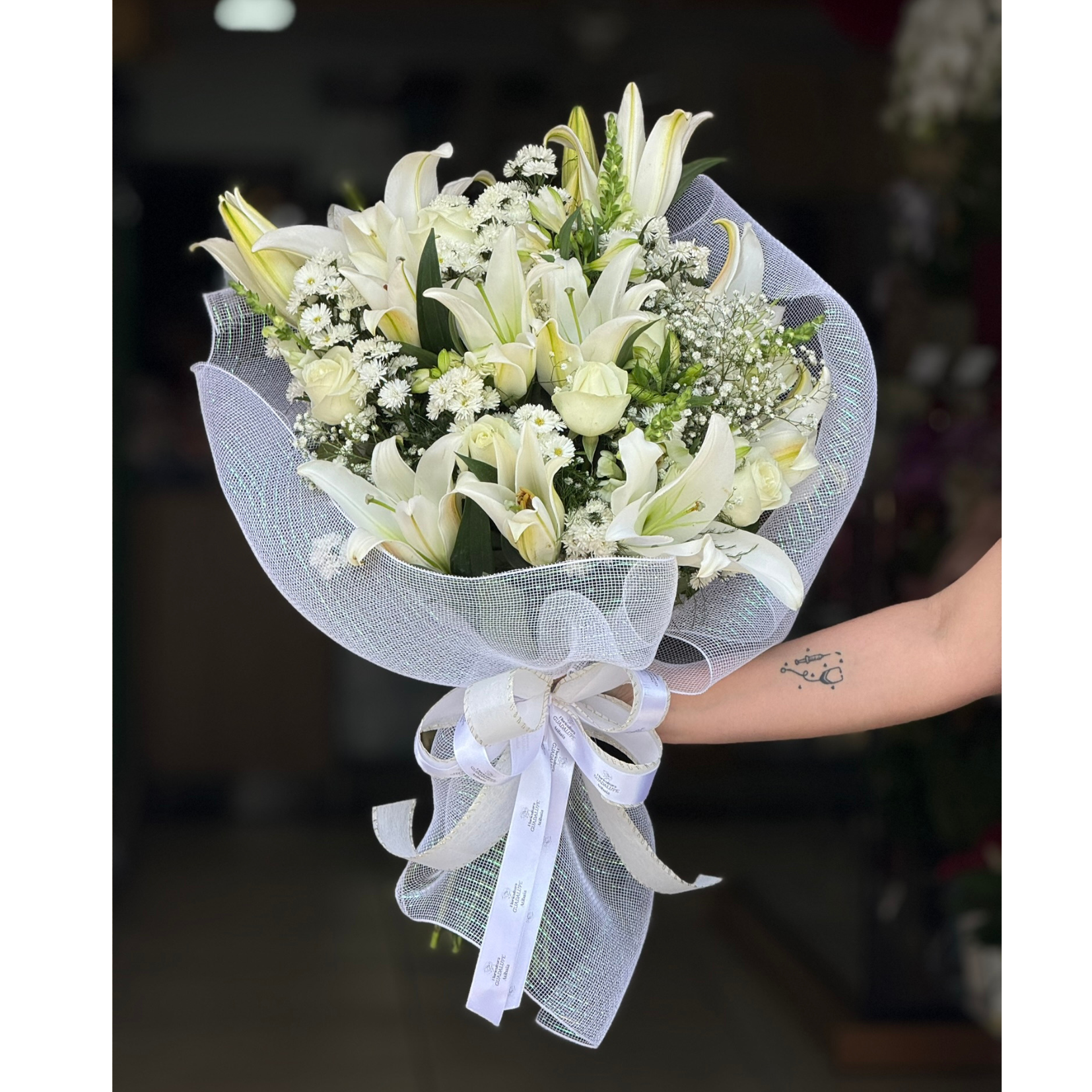 Buquê de lírios e flores nobres desconstruído em embalagem tela de luxo tamanho grande