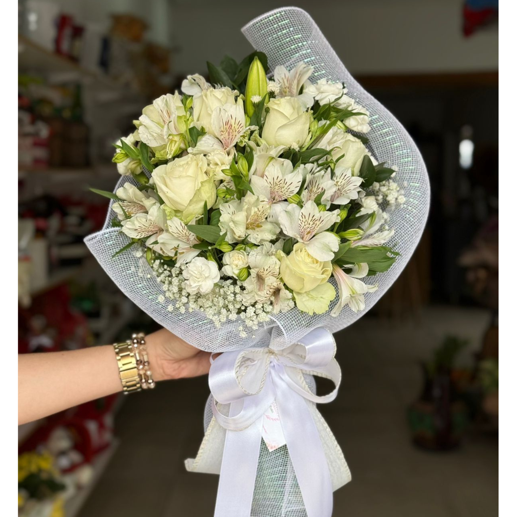 Buquê composto por lírio, rosas brancas, astromelias e demais flores brancas em embalagem tela de luxo