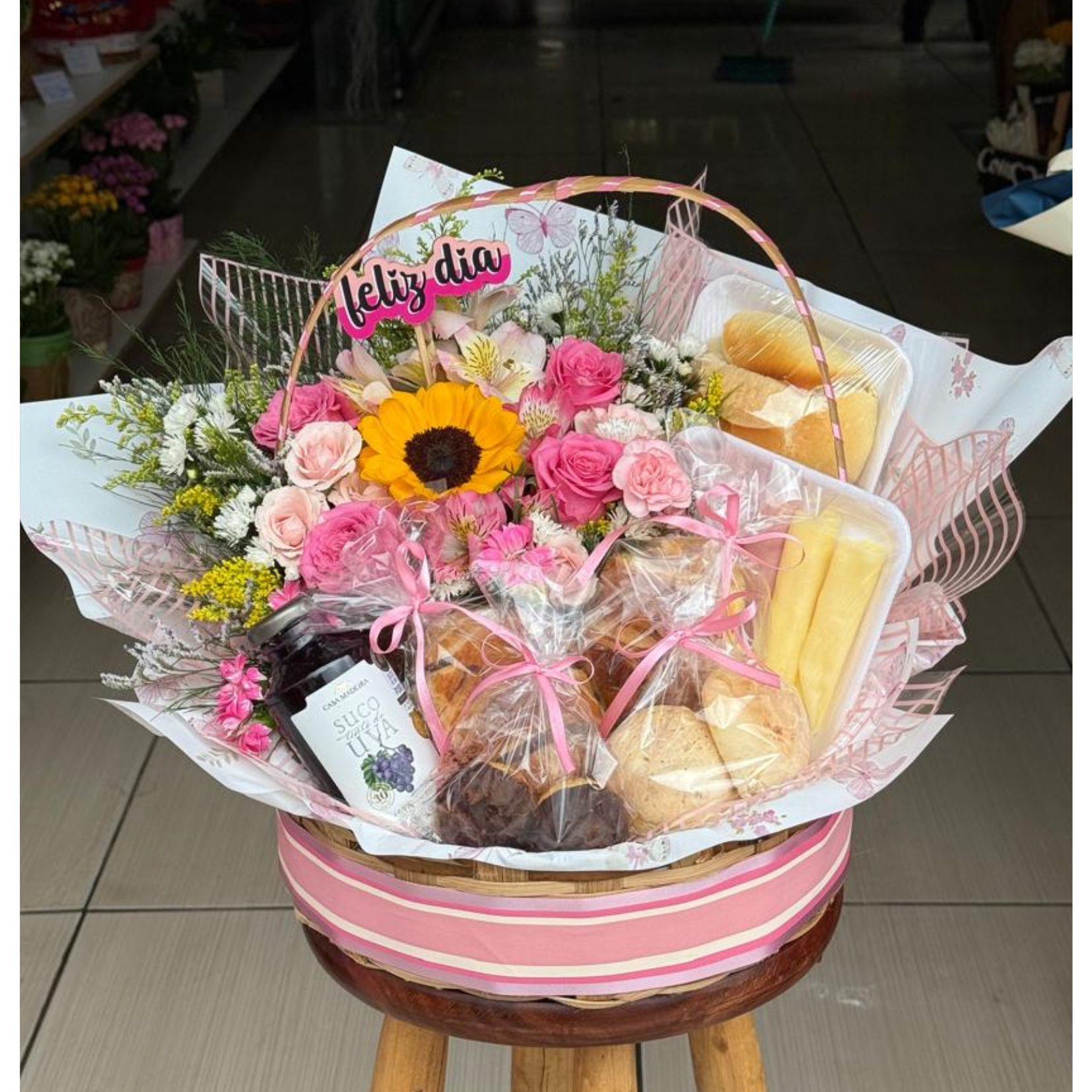 Cesta de café da manhã composta por arranjo de flores, suco de uva integral, pão francês, pão de queijo, croissant doce, croissant salgado, carolinas, frios