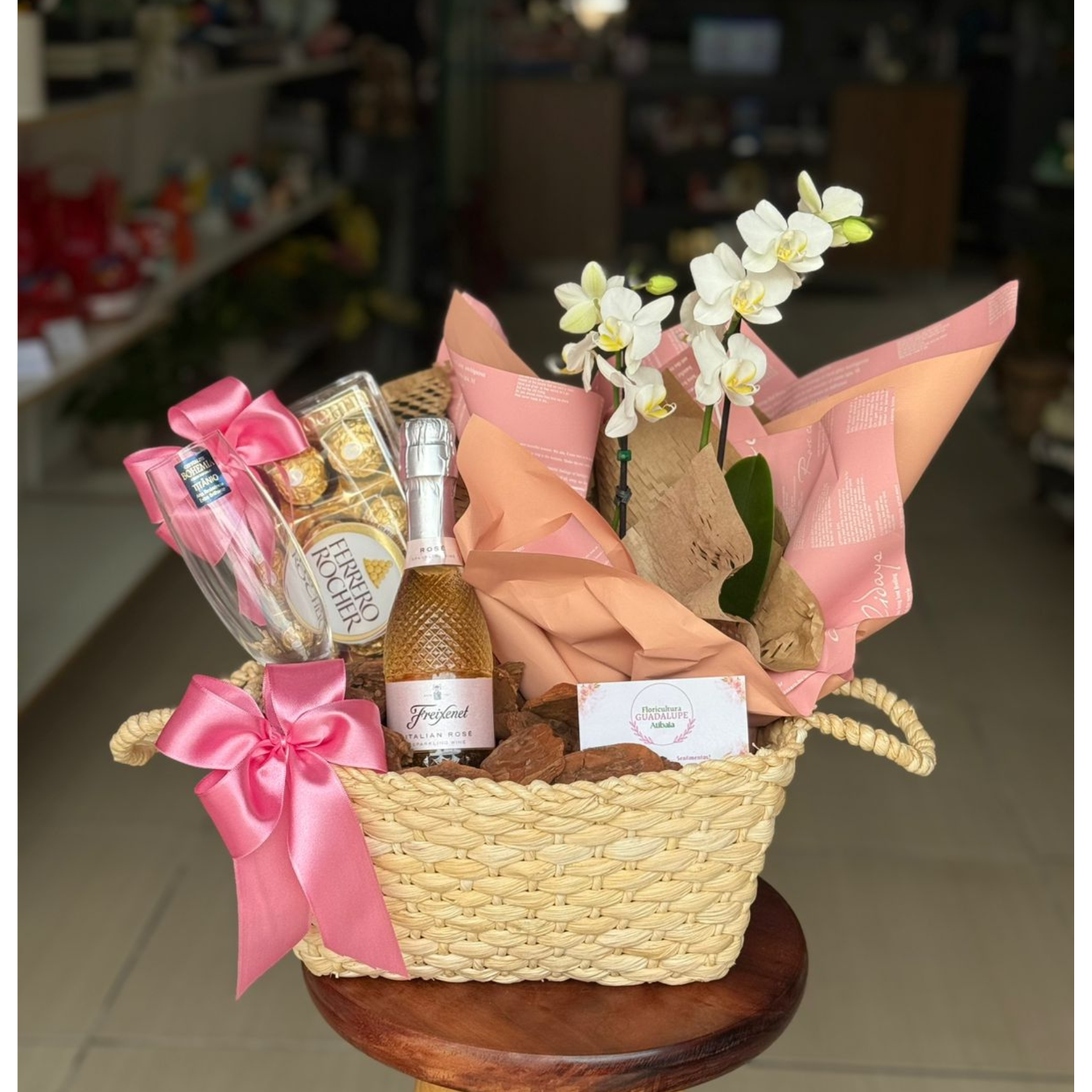 Cesta de luxo composta por espumante freixenet rose, ferero rocher 12un, mini orquídea e taça de cristal para espumante bohemia