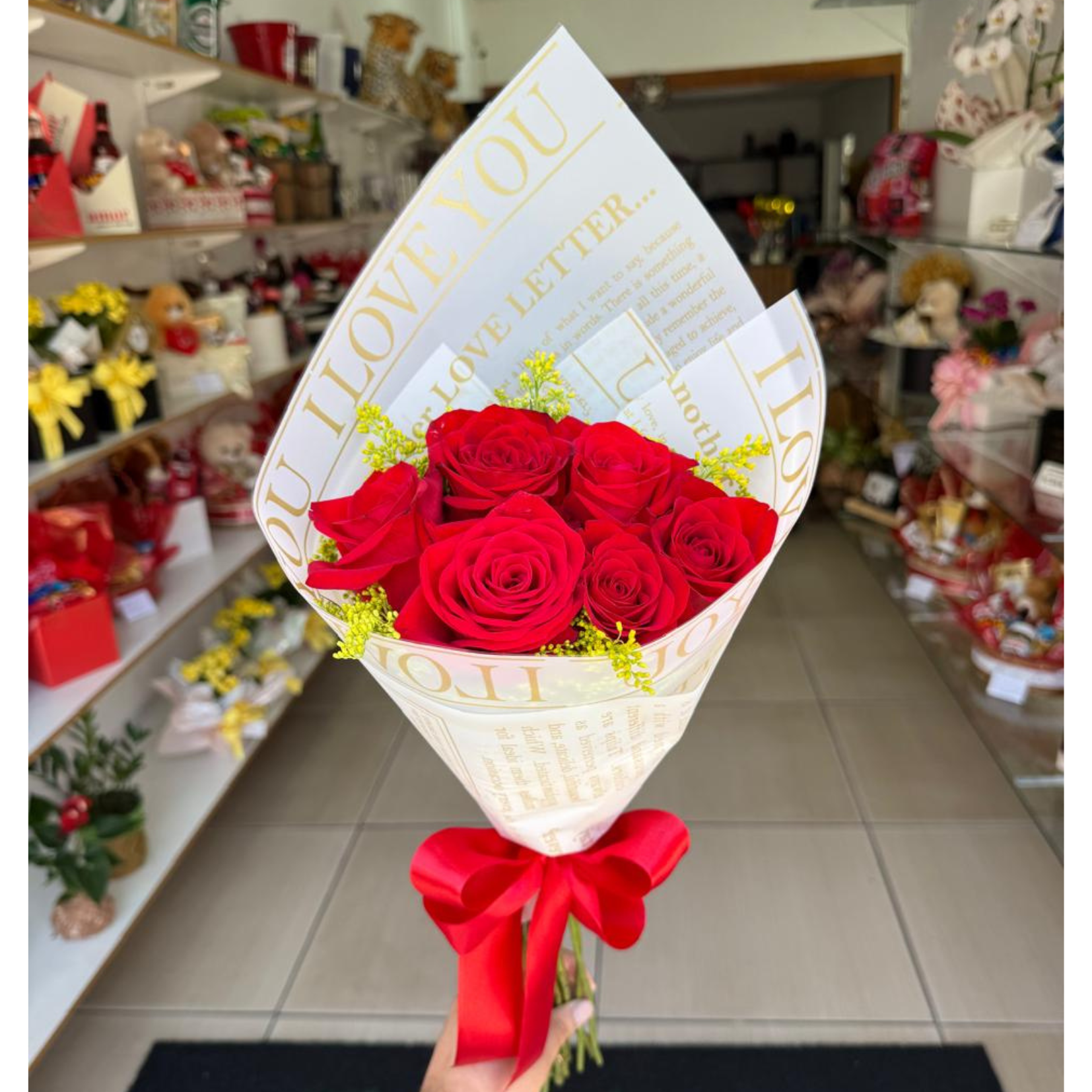 Combo composto por 6 unidades de rosas vermelhas colombianas, adicional de tango ou outra flor complementar em embalagem jornal