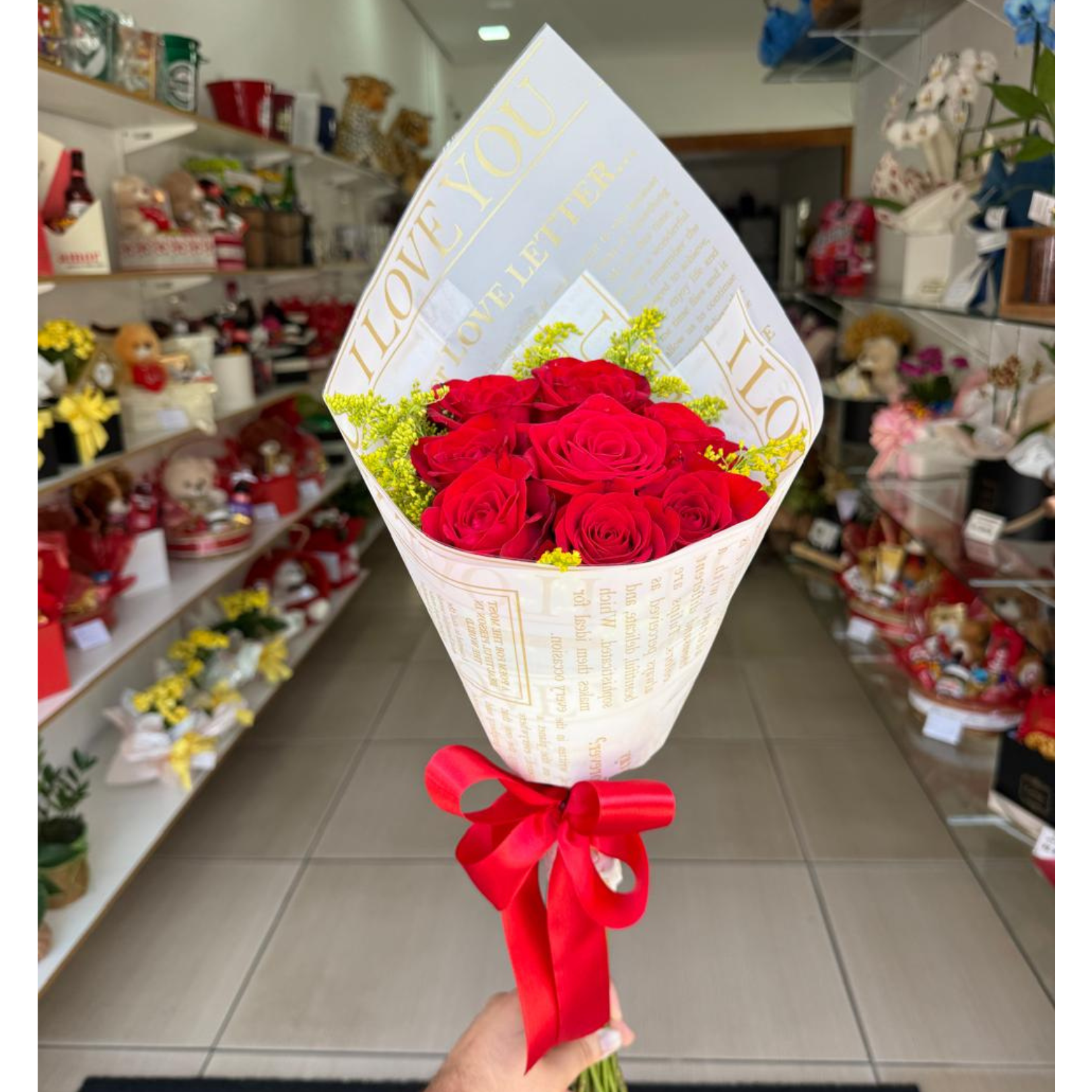 Combo composto por 8 unidades de rosas vermelhas colombianas, tango ou outra flor complementar em embalagem de jornal