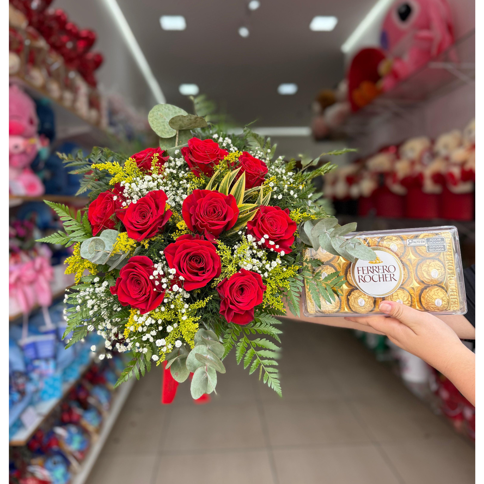 Kit composto por buquê de 10 rosas vermelhas e Ferrero rocher 12un