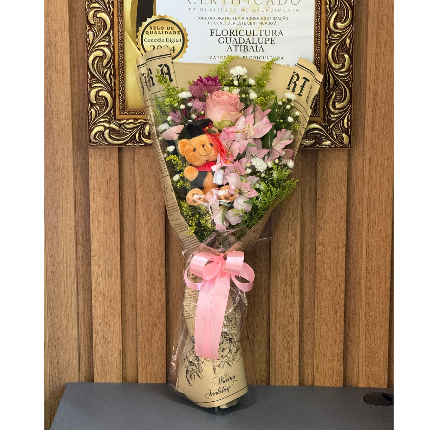 Mini buquê composto por uma rosa e demais flores em embalagem especial com pelúcia para formandos mini