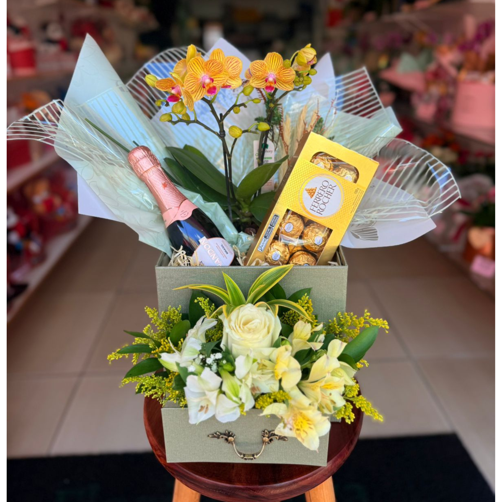 Caixa de luxo, arranjo de flores naturais, espumante chandon, mini orquídea, bombom ferrero rocher