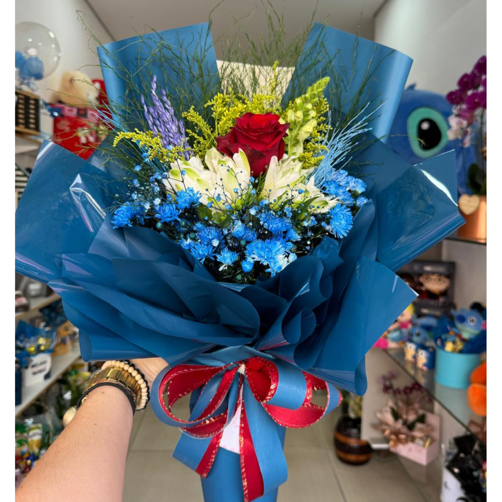 Mini buquê composto por uma rosa vermelha e demais flores complementares em embalagem de luxo azul