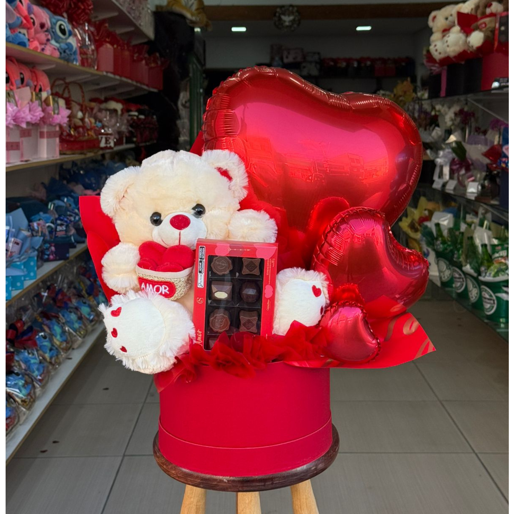 Box luxo composto por pelúcia urso M com coração, Chocolate cacau show love e arco de balões com adornos em papel
