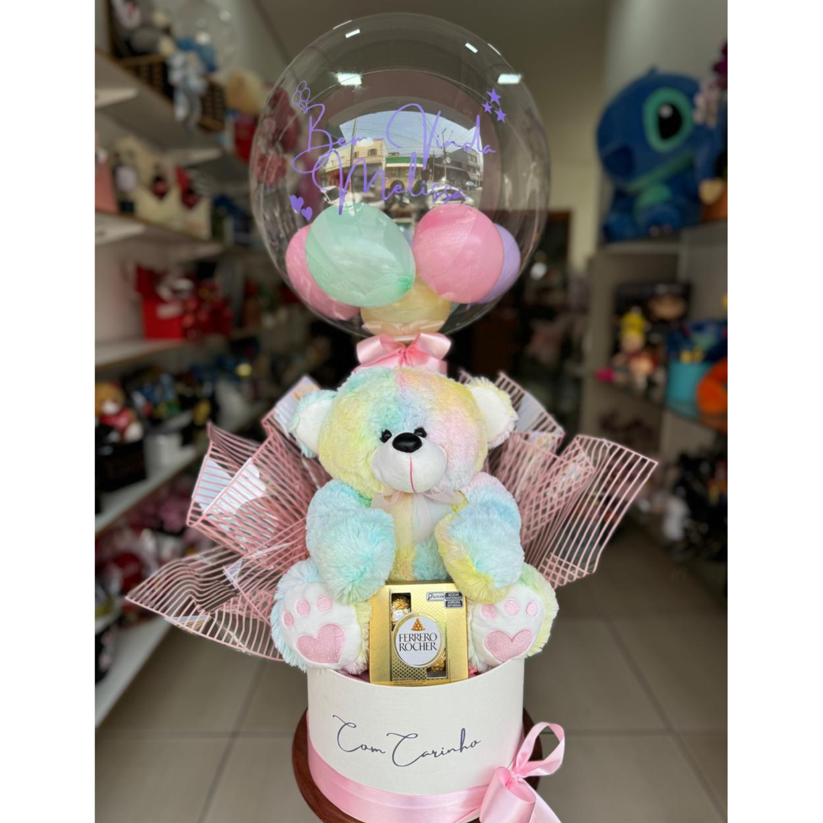 Urso tuti color, bombons ferrero rocher 8un , balão bubble personalizado