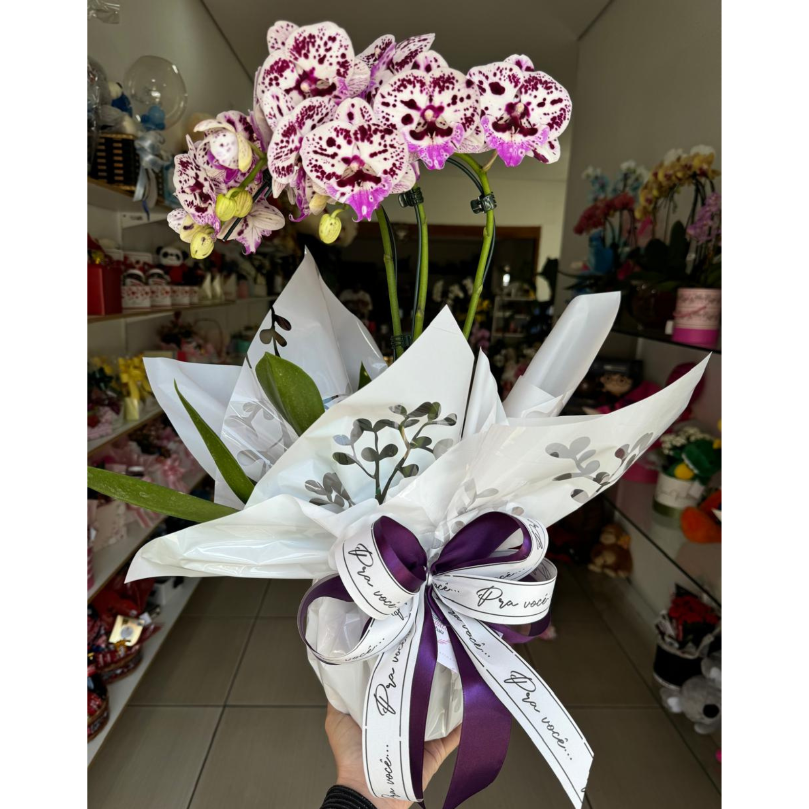 Orquídea em embalagem de presnte (cor disponível em estoque)