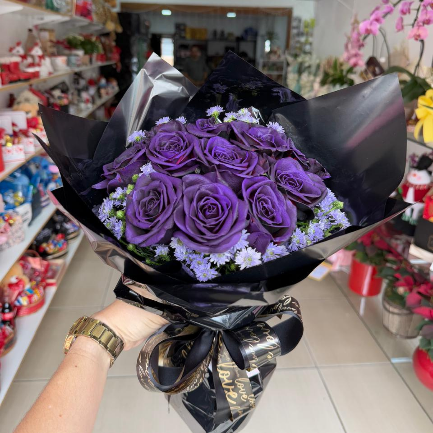 Buquê composto por combo de 10 rosas tingidas em tons de preto e roxo Ver Descrição Completa