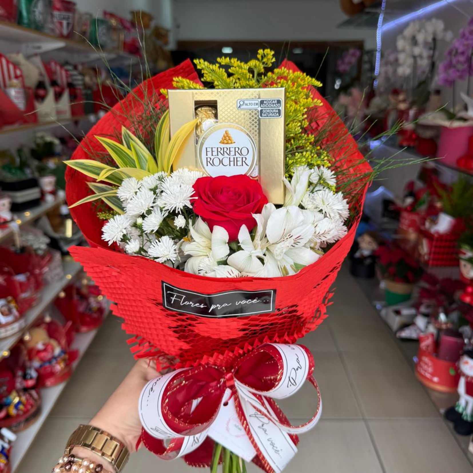 Mini buquê rosa unitária composto por rosa vermelha e demais flroes com ferrero rocher 4un em embalagem colmeia