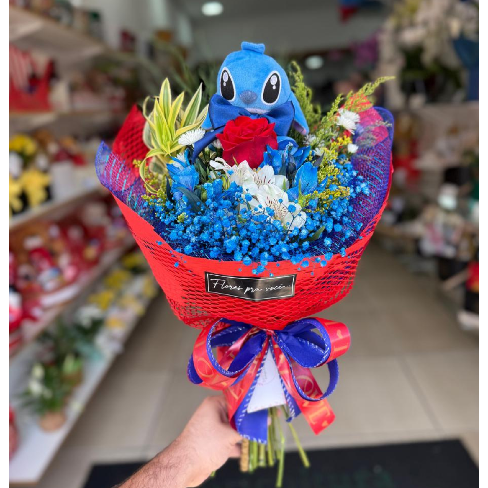 Mini buquê composto por uma rosa e demais flores com pelúcia stitch chaveiro em embalagem colmeia